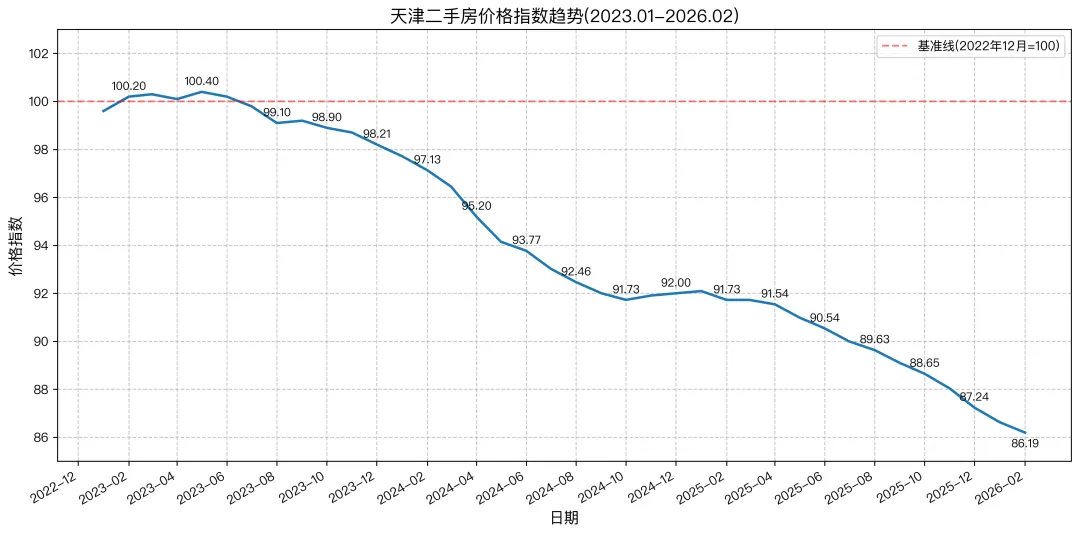 综合看来天津二手房价格指数在近三年内呈现持续下行态势,指数从2022年12月的100下降至2026年2月的86.19,累计跌幅达13.81%。连续38个月中仅少数月份反弹,整体无有效回升信号,2026年1-2 月跌幅未见明显放缓,表明市场整体处于价格调整周期。