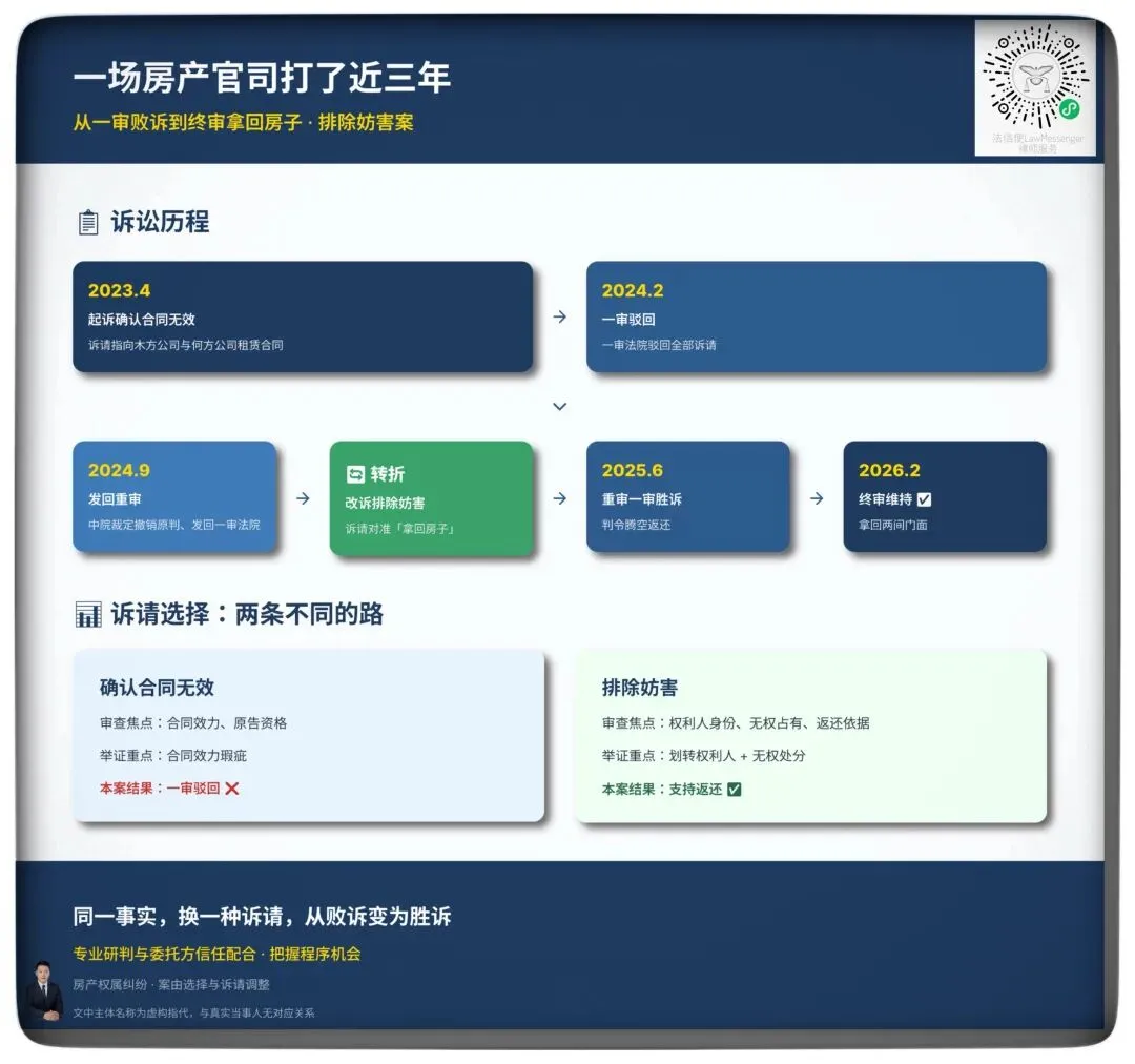 全方集团在法定期限内提起上诉。2024 年 9 月,上海市第一中级人民法院裁定:撤销原判,发回浦东法院重审。中院未直接改判,而是认为原审认定基本事实不清,需由一审法院重新审理。发回重审意味着案件按一审程序重来,当事人可在法定范围内变更、增加诉讼请求并重新举证、质证。对全方集团而言,这正是代理律师此前所争取的程序空间——能否翻盘,关键看重审阶段诉请与论证是否对准法院的审查焦点。一审败诉后的复盘中,委托方与律师对「拿回房子」这一核心目标达成共识;发回重审提供了调整诉请的程序空间,律师建议改用排除妨害,委托方采纳。律师团队在重审立案前做了两件事:一是重新锚定诉讼目标——客户要的是「拿回房子」,而不是仅争合同效力;二是选定更贴合的案由与诉请。「确认合同无效」审查的是合同效力与原告资格;「排除妨害」审查的是原告是否为权利人、被告是否无权占有、返还是否有据。同一事实,换一条路径,举证责任与法院审查重点完全不同。重审立案时,案由变更为「排除妨害纠纷」,诉请改为:判令南方公司腾空系争两间门面并返还全方集团,木方公司、何方公司予以配合。