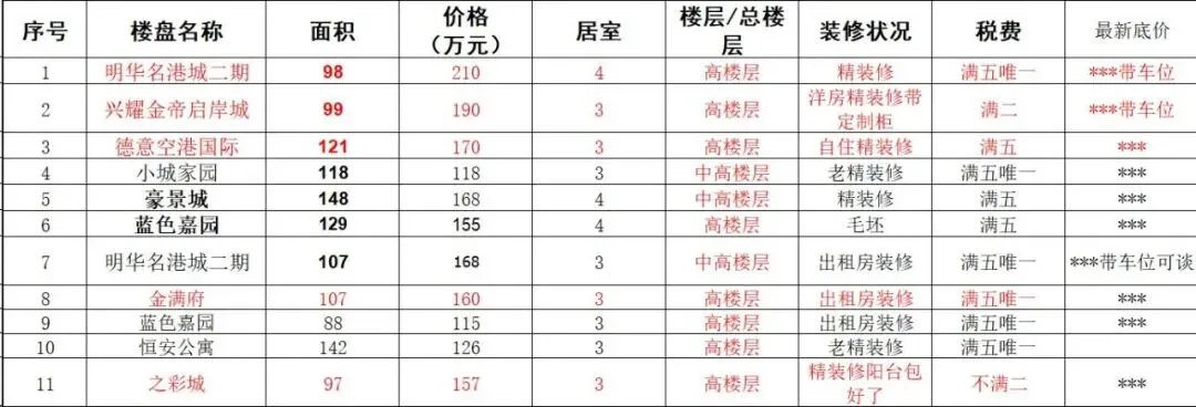这类房源通常位于品质小区,装修好,或附带稀缺资源。No.1 明华名港城二期 98㎡ | 210万 | 4房No.2 兴耀金帝启岸城 99㎡ | 190万 | 3房No.5 豪景城 148㎡ | 168万 | 4房2. 高性价比实用三房(总价115万-170万)