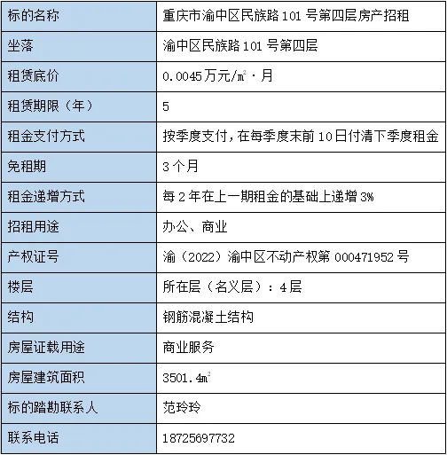 位于重庆市渝中区民族路101号第四层房产在重庆产权交易网挂牌招租,挂牌价为0.0045万元/m2·月,租赁期限5年(部分相关信息如下)。有意承租者可点击文末“阅读原文”登录重庆产权交易网了解详情。