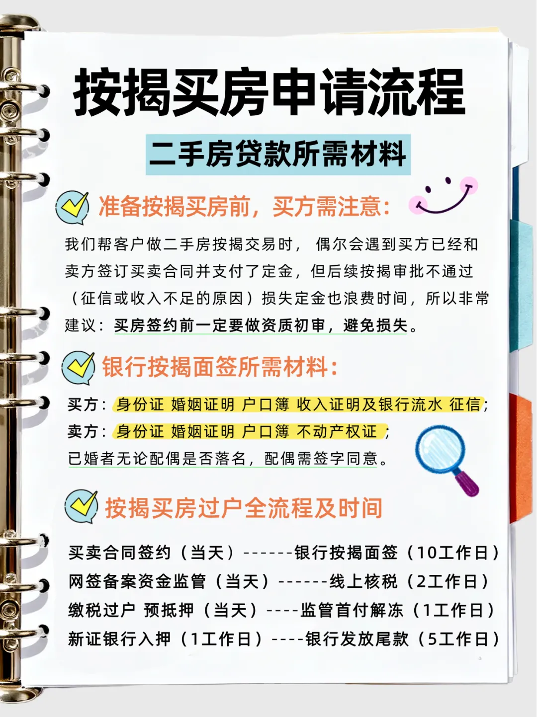 上图列举了银行面签所需材料、和按揭过户全流程