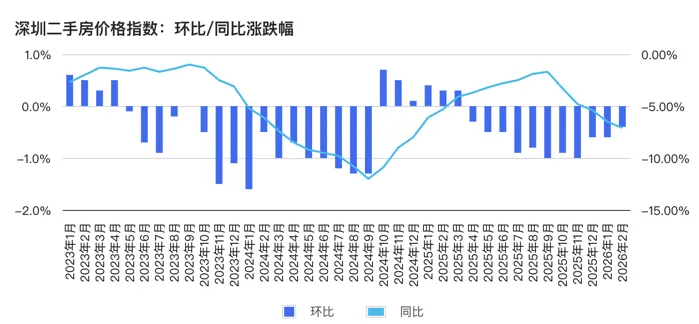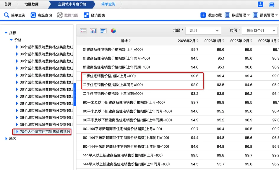 筛选深圳,上月100,2月是99.6,也就是环比下跌0.4%;上年同月100,2月是92.9,也就是环比下跌7.1%。
