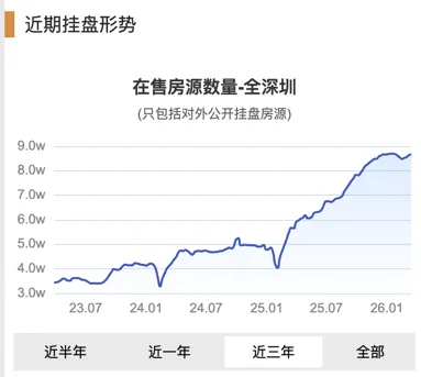 下面这个图,是「行舟深房」小程序显示的,近3年的全深圳二手房挂牌量趋势图。