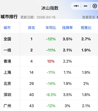 冰山指数里全国的租售比已经去到2.7%,上海是1.9%,北京是2%,深圳是1.8%,广州是2.1%。