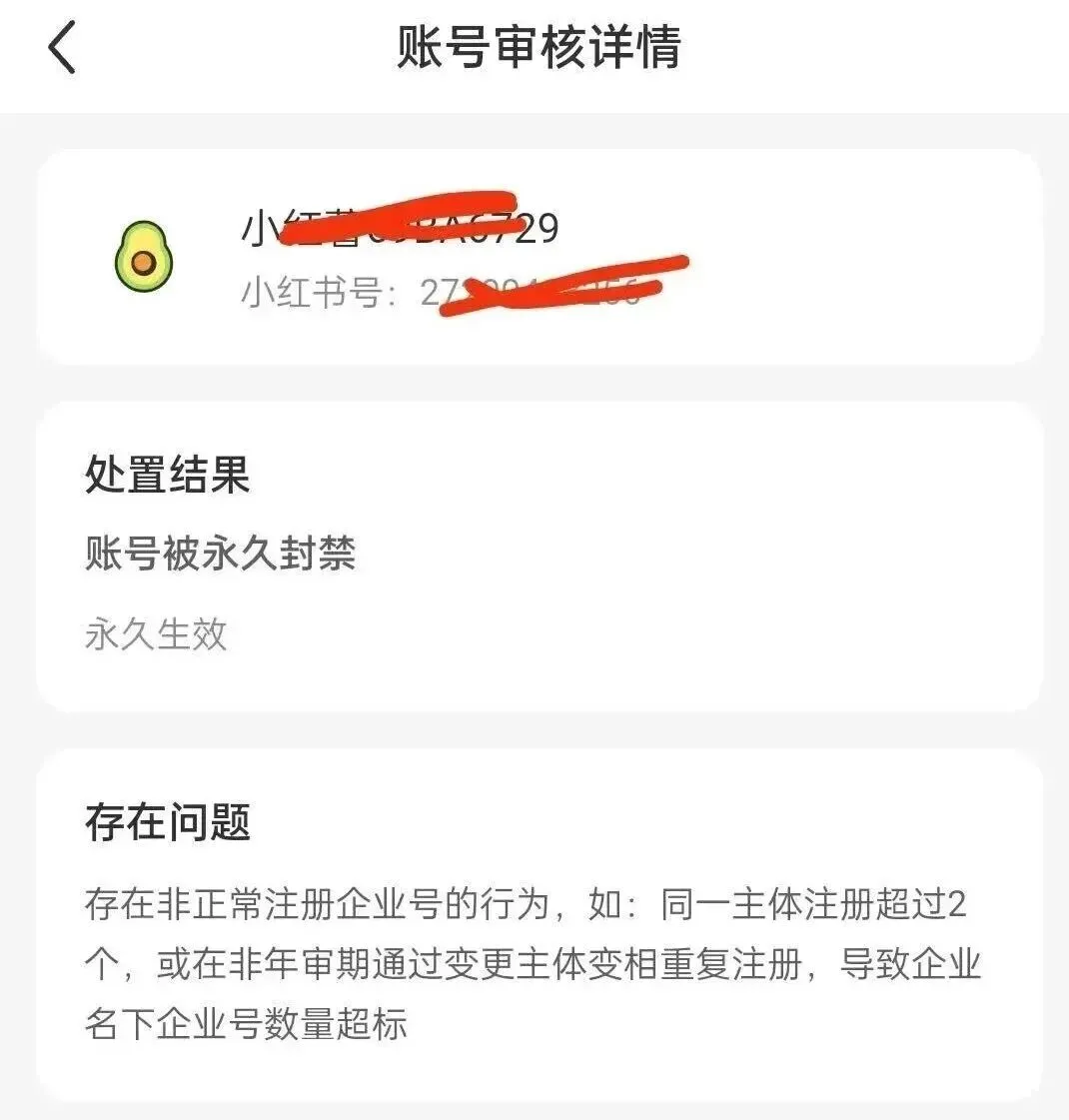 而3月12日后小红书审核同步“一执照限认证2个号”,随即对2月25日-3月11日期间认证的超量账号进行无预警、无协商、无补救通道的批量封禁,“既不要求补全资料、注销蓝V整改,也不提供申诉机会,更拒绝退还已缴纳的认证费。”