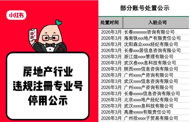 3月18日下午,小红书发布《房地产行业违规注册专业号停用公示》,公示了一批被处置的账号。