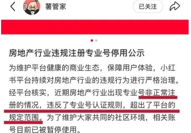 小红书官方表示,近期房地产行业出现专业号非正常注册的情况,违反了专业号认证规则,超出了平台的规定范围。