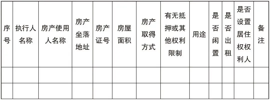 执行律师须对查询到的被执行人房产信息进行整理。团队律师可负责此项工作,整理内容涵盖被执行人名称、房产使用人名称、房产坐落地址、房产证号、房屋面积、房产取得方式、有无抵押或其他权利限制、用途、是否闲置、是否出租、是否设置居住权权利人、备注等。若被执行人拥有多户房产的,要一并统计。房产情况登记见表4。