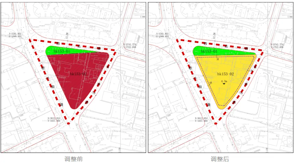 根据批复方案,hk153-02地块用地性质由原先的商办用地,调整为三类住宅组团用地,用地面积由6393㎡微调至6100㎡,容积率保持2.5,计容住宅建面约1.5万㎡,限高60米,地块内需配建400㎡社区配套设施。