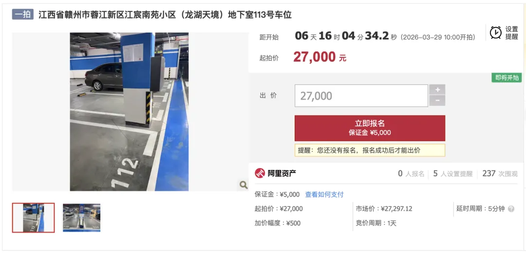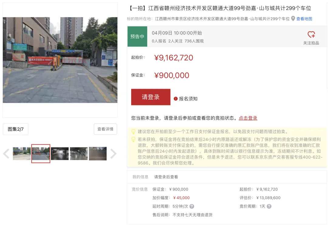 近日,该小区共计 299 个地下产权车位突然在京东平台上架拍卖。这批车位评估总价为 1308.96 万,起拍总价 916.272 万,将于 4 月 9 日上午 10 点开拍,这也是这批车位首次拍卖。
