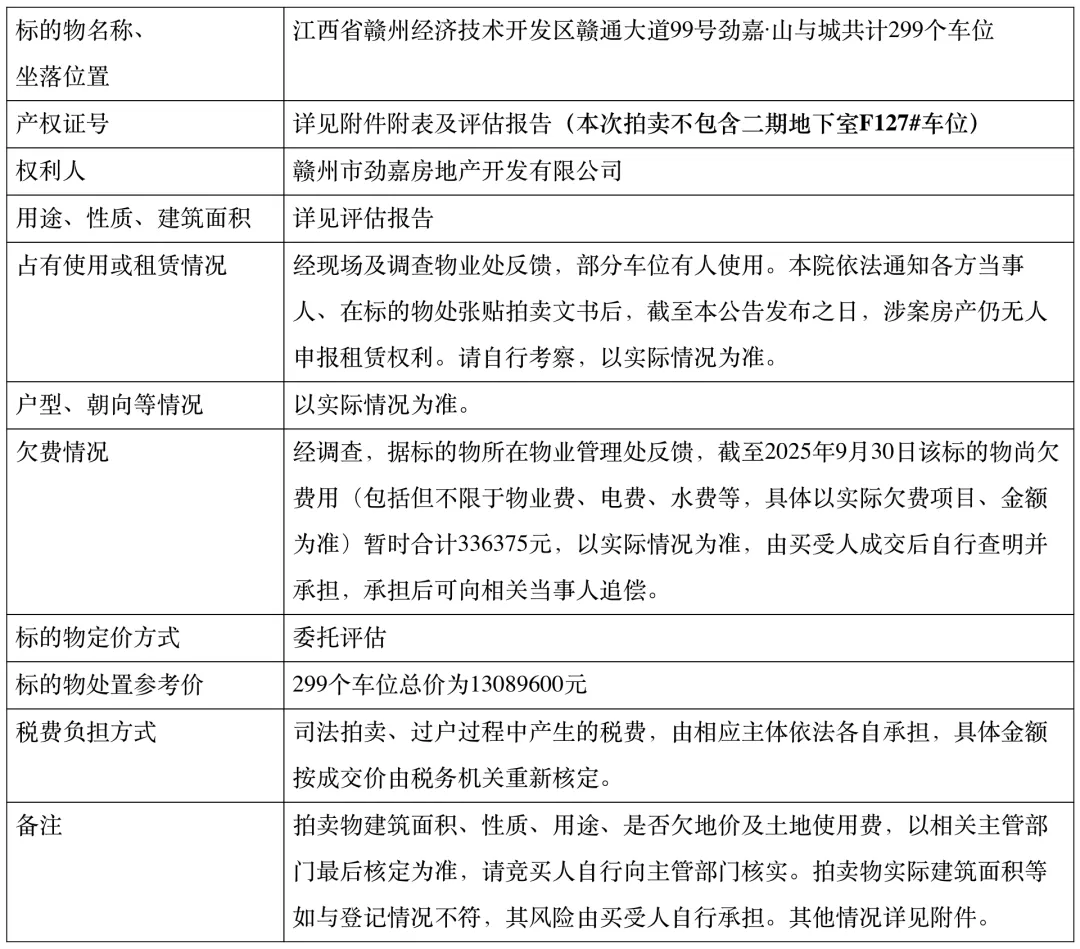 ▲ 赣州经开区劲嘉山与城299个拍卖地下车位基本信息
