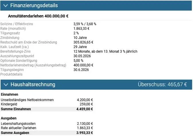 3. 家庭支出(银行算法)银行贷款利率为每年3.59%,首年本金偿还率(Tilgung)为2%。在这种情况下,月供金额为1863.33欧元(计算方式:40万 × (3.59% + 2%) ÷ 12 = 1863.33欧元)。