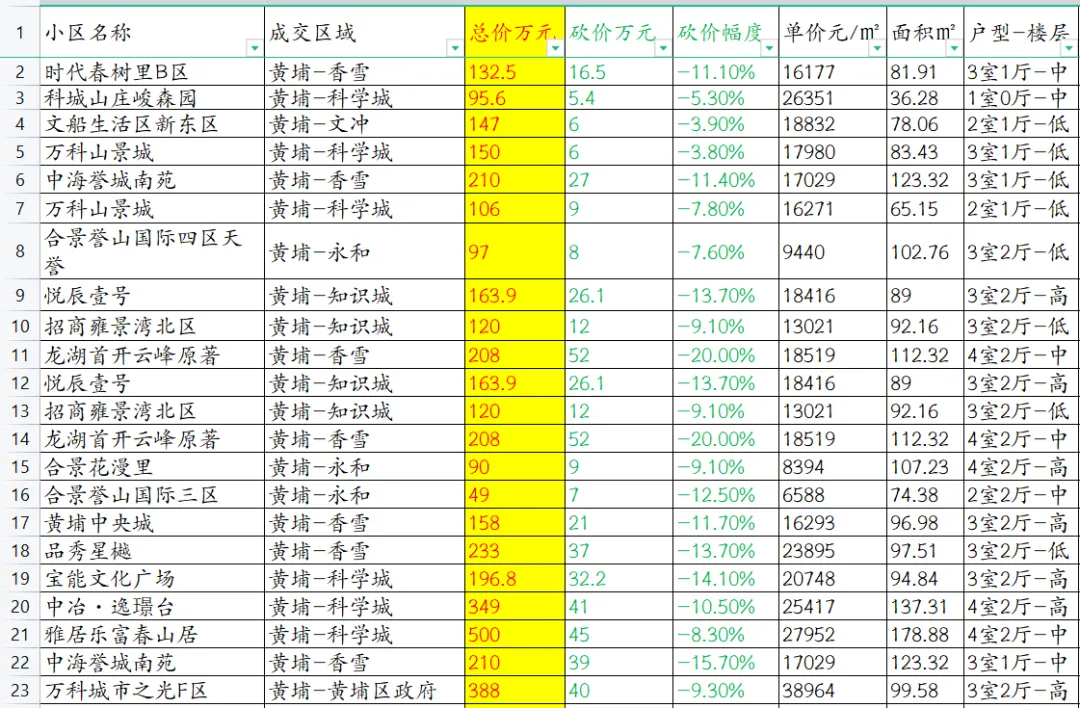 数据详情请查看图片,其中总价代表真实成交价,砍价万元+总价万元=挂牌价。