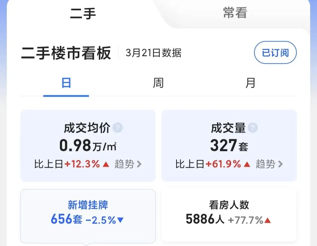 (2026.03.21)根据武汉某壳数据,二手房成交327套,新增挂牌下降2.5%,看房客户上涨77.7%。