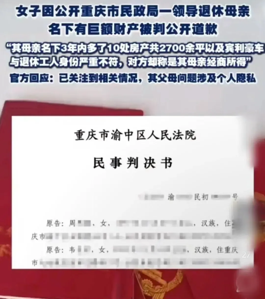 一边是无经商背景、无高额收入来源的退休身份,一边是远超普通人想象的巨额资产,如此强烈的反差,自然让舆论一片哗然。更让大家关注的是,老人的儿子,恰好是重庆市民政局的一名处级干部。公职人员亲属出现异常财产变动,向来是公众最敏感、也最在意的话题,此事一经曝光,很快便冲上热议焦点。