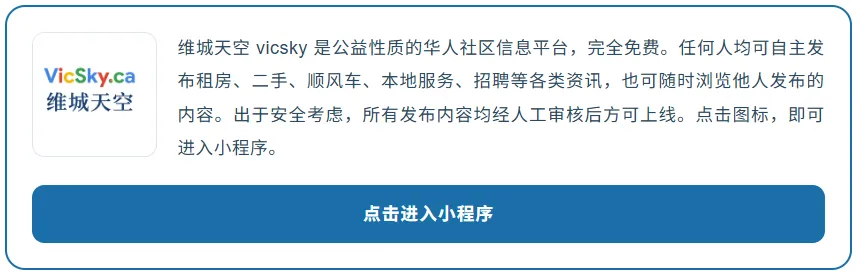 维城天空 · vicsky.ca 一个公益性质的华人社区信息广场,对社区用户免费开放,任何人均可自主发布或浏览租房、本地服务、二手、顺风车、招聘等各类生活资讯。目标是为维多利亚华人社区建立一个属于自己的、开放共享、彼此推荐、可靠的信息流通渠道。 |