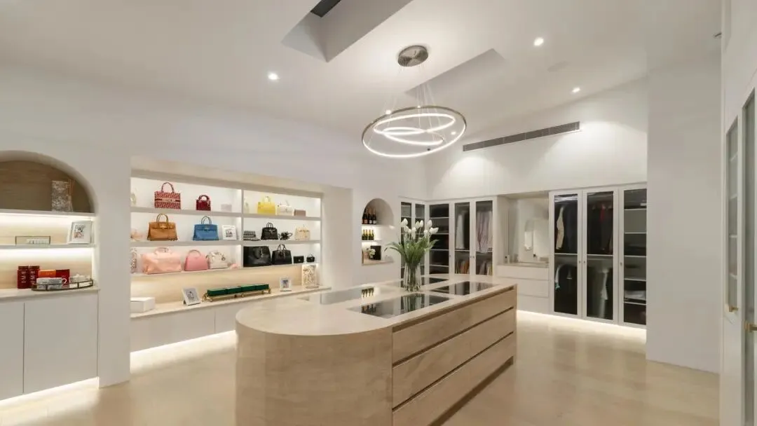 占地250平方米的主卧套间占据了整整一层楼,内设起居室、壁炉和铺设洞石的套内浴室,其巨大的步入式衣帽间甚至配有专门的香槟站。