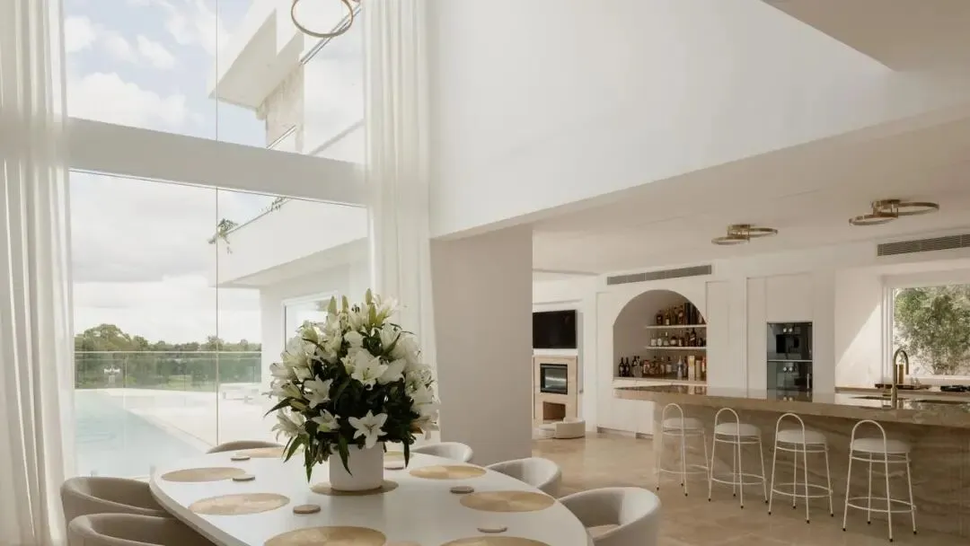 用餐区位于高耸的挑空空间下方,阳光透过落地玻璃洒入室内。