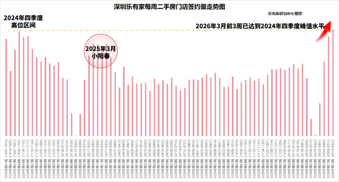 测数据显示:3月22日(周日),深圳二手房门店签约量创下近5年最高记录,同比前一周周日上涨11%,甚至比2024年国庆假期的单日历史峰值(2024.10.7)还高出4%——相当于“超越了自己的纪录”。