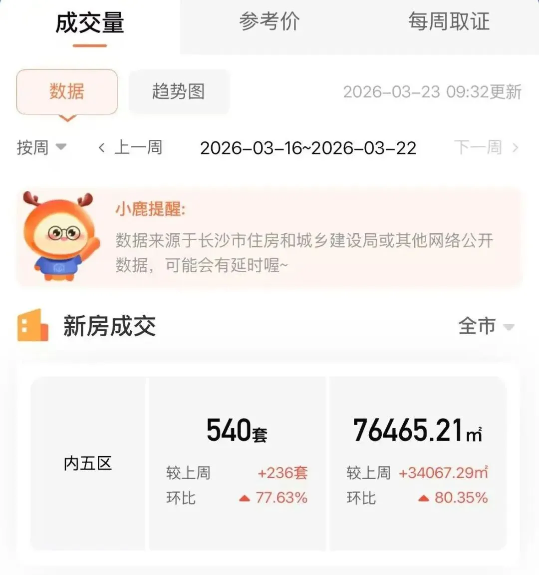 据长沙小鹿购房小程序显示,2026年3月第三周长沙网签新房住宅成交540套,较上月增加236套,环比上涨77.63%。(3月16日-3月22日)