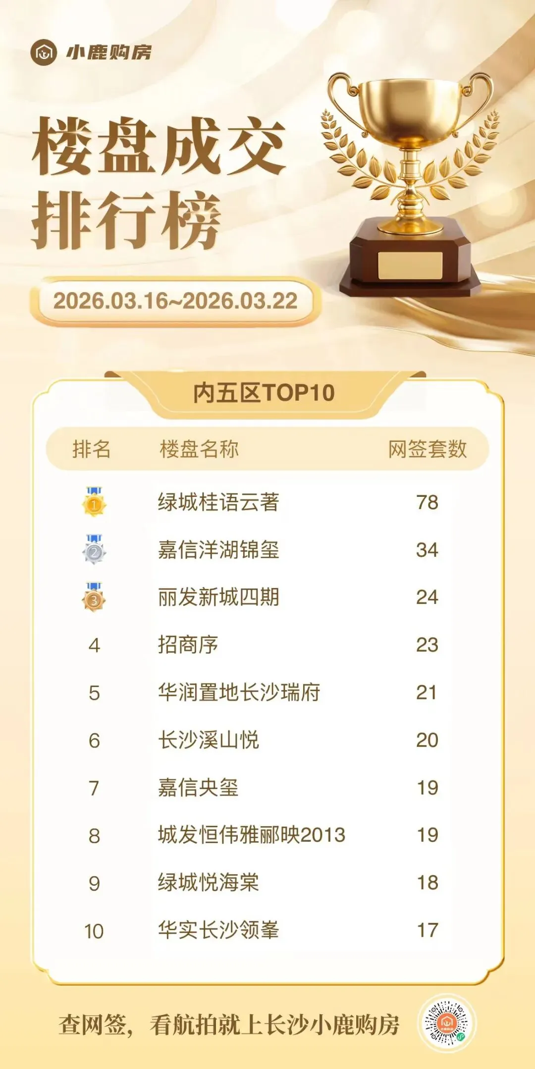 上周长沙内五区成交排行榜出炉,内五区网签成交数据排名前3分别是绿城桂语云著(78套)、嘉信洋湖锦玺(34套)、丽发新城四期(24套)。