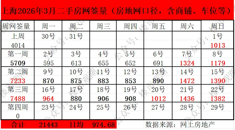 3月第三周(3月16日-22日),上海二手房网签7488套,继上周刷新2021年之后的最高周纪录之后,进一步刷新了最高单周纪录。连工作日单日网签都在900套以上,实属罕见。最新消息: