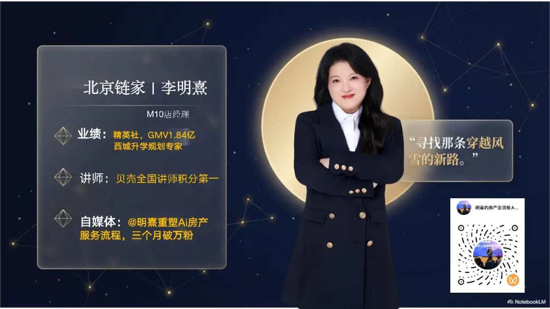 当看到今天这场分享活动的海报时,我想了很久,最终为她定下了一个名字——“岂曰无衣,与子同裳”。这句话出自两千多年前的《诗经·秦风》,描写的是战场上最艰难的时刻,将士们彼此扶持:“谁说你没有衣服穿?我把我的战袍分给你,我们一起战斗。”在当下这个充满挑战与变革的新时代,这也是我对msl行业精神的感悟。我叫明熹。2012年,我加入链家,从一名实习生一路走来。今天,我身上有三个重要的标签:第一,西城升学规划专家,在去年达成了1.84亿Gmv的业绩;第二,全国贝壳三万名讲师中积分排名第一的讲师,25年完成42堂课程;第三,我是一个Ai教学视频号创作者,我创立了“明熹Ai重塑房产”视频号,仅用一百天就收获了一万粉丝,播放量突破百万。这三个标签的背后,源于一场“漫天的大雪”。
