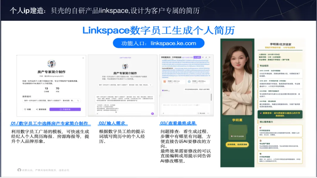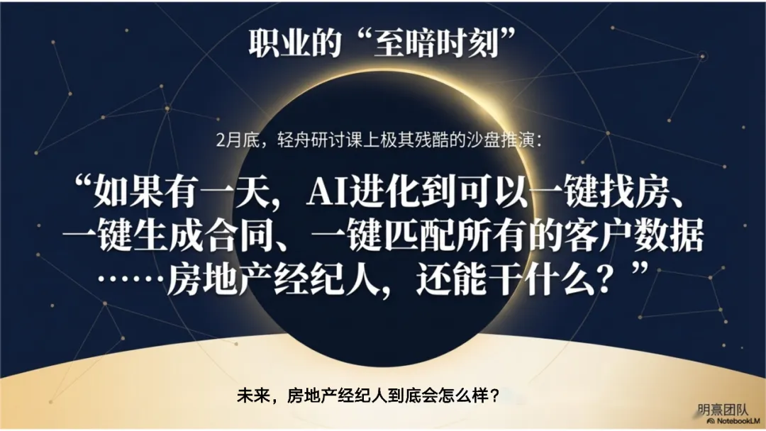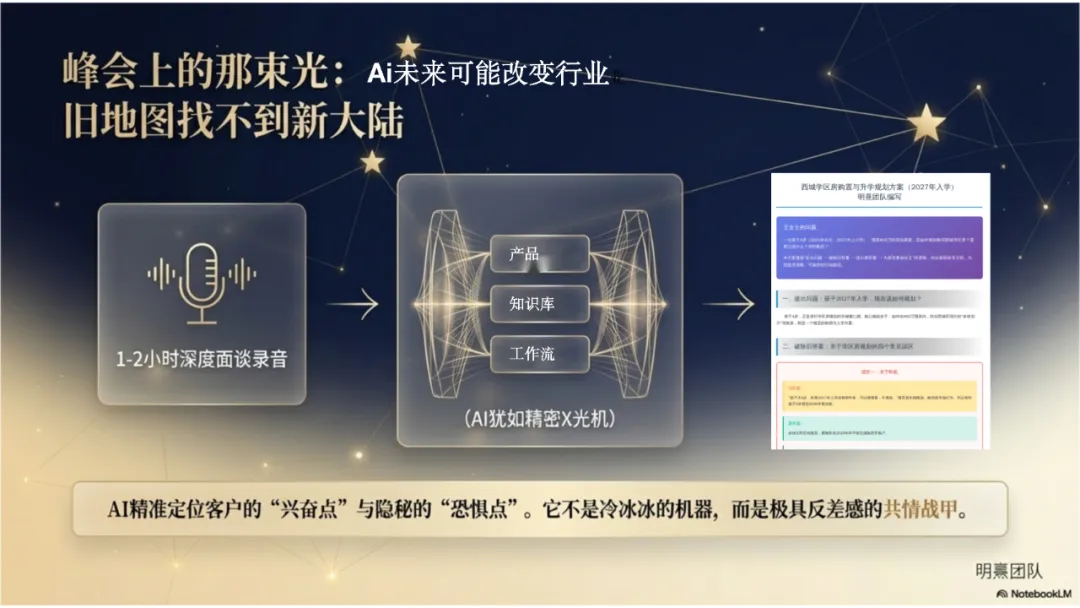 在最难过的15天里,我去了南京上一场房产经纪行业峰会,试图寻找答案。当听到关于AI的分享时,我仿佛抓住了一根救命稻草:如果旧地图找不到方向,AI能不能成为我的新道路?于是,我开始疯狂地研究AI,探索如何用它重塑产品、场景和工作流程。在急速下降的市场中,客户充满了恐惧与不确定性,而AI对我来说不再仅仅是一个工具,而是解决客户痛点、寻找未来方向的灯塔。重塑边界:AI如何赋能房产经纪服务