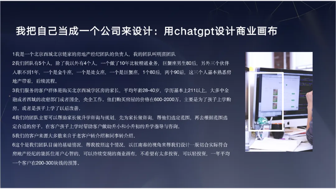 - 用AI重塑商业定位与人设我利用AI帮自己梳理了“商业画布”,重新定义了目标客户与痛点。我们的Slogan变成了:“明熹团队做家长最放心的升学换房团队”。我用AI重新设计了个人海报,去掉了那些高高在上的“销冠”荣誉,而是将核心放在“我能为你做什么”。因为在当下,客户需要的不是一个有距离感的销冠,而是一个能在不确定性中给他提供稳定感、愿意和他站在一起的伙伴。