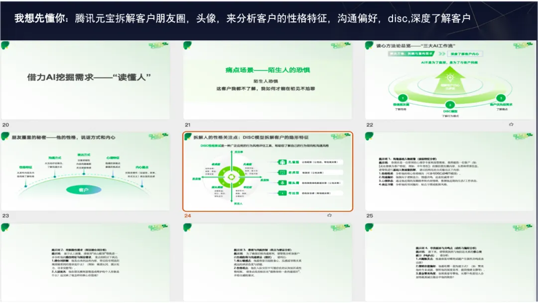 - 用AI提供未曾谋面的“情绪价值” 在这个时代,客户不选择你,往往不是因为你不专业,而是因为沟通中缺少了同频的默契。为了更懂客户,我利用AI拆解了服务流程。在见客户之前,我会用一系列AI提示词,通过他们的朋友圈、头像等微观信息进行性格分析。这个分析的准确率能达到70%,但我只向客户展现40%-50%,做到“刚好你想要,刚好我有”,为客户提供恰到好处的情绪价值与专业匹配。