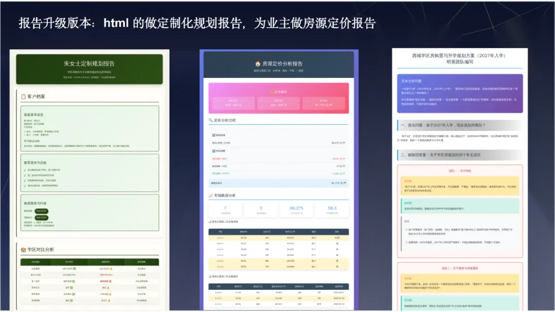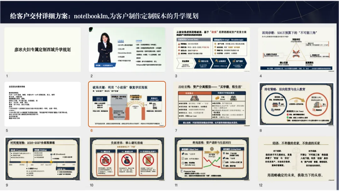 - 用AI打造极致的超级知识库与定制交付 凭借十年的升学规划经验,我为客户整理过长达108页的系统升学规划PPT。现在,我将这些庞杂的信息(学校讲解、校长致辞、周边配套等)全部喂给AI,建立了一个专属的知识库,实现了“随时问、随时答”的精准检索。不仅如此,我还利用AI为客户制作千人千面的定制报告。无论是HTML网页、PPT、腾讯文档还是图片,无论客户偏好什么颜色和风格,AI都能帮我高效生成,完美适配大厂员工等不同客户的阅读习惯。