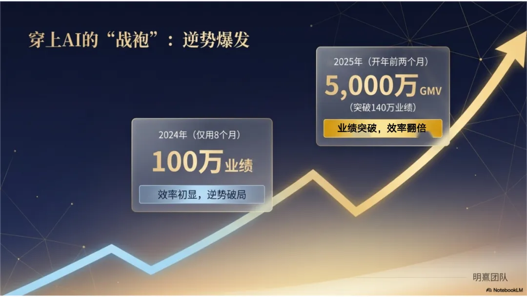 在这个过程中,AI就像给我穿上了一件战袍。在没有任何资源的情况下,我用AI赋能业务,2024年做出了100万的业绩,2025年仅用两个月就达成了5000万GMV。