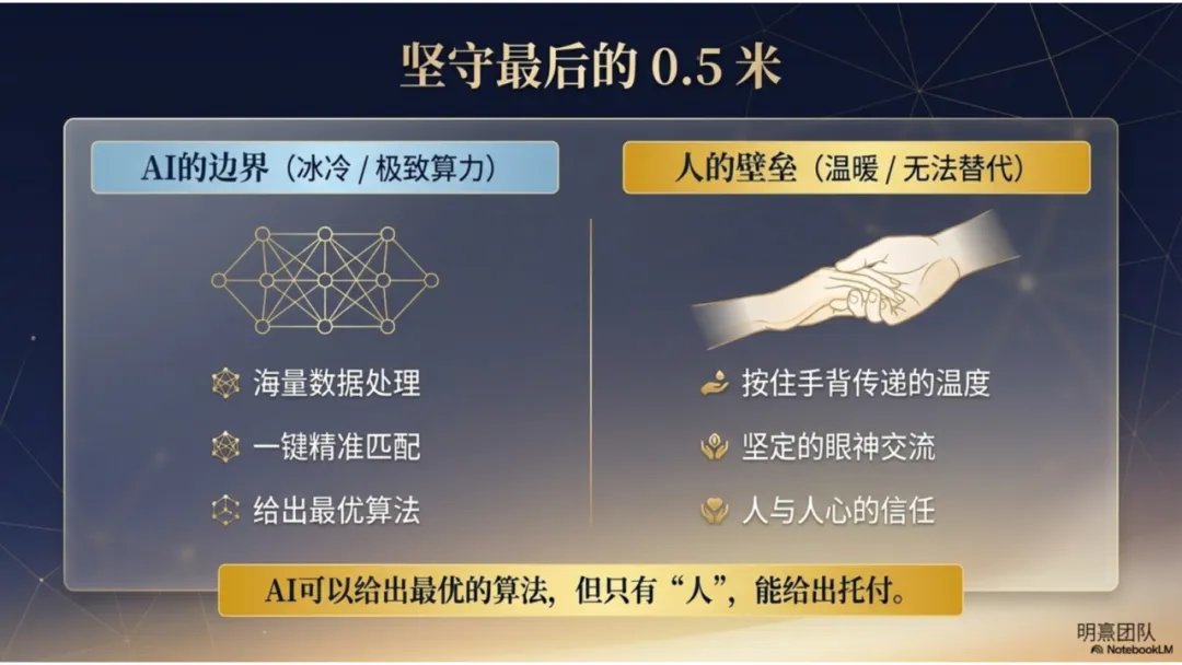 但在我最得心应手的时候,一场培训课上的沙盘演练给了我沉重的一击。那个问题是:如果有一天,AI进化到可以一键找房、一键匹配数据,房地产经纪人还能干什么?难道我们要变成机器人吗?那是我的又一个至暗时刻。但痛苦往往带来清醒,我最终找到了答案:AI可以完成所有基础的分析、拆解和匹配,但它永远无法替代人与人之间“最后0.5米”的温度。AI无法替代我看向客户时的眼神,也无法替代人内心真实的触动和共鸣。AI是初心,它负责提供确定性,而我负责传递手心的温度。兼济天下:做难而正确的事