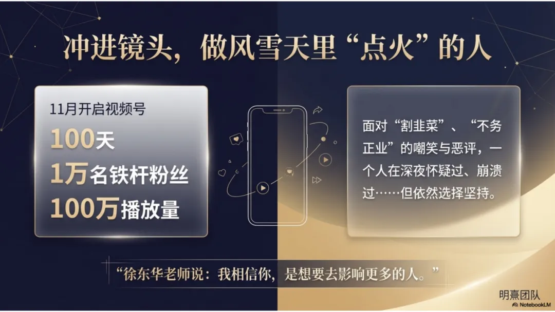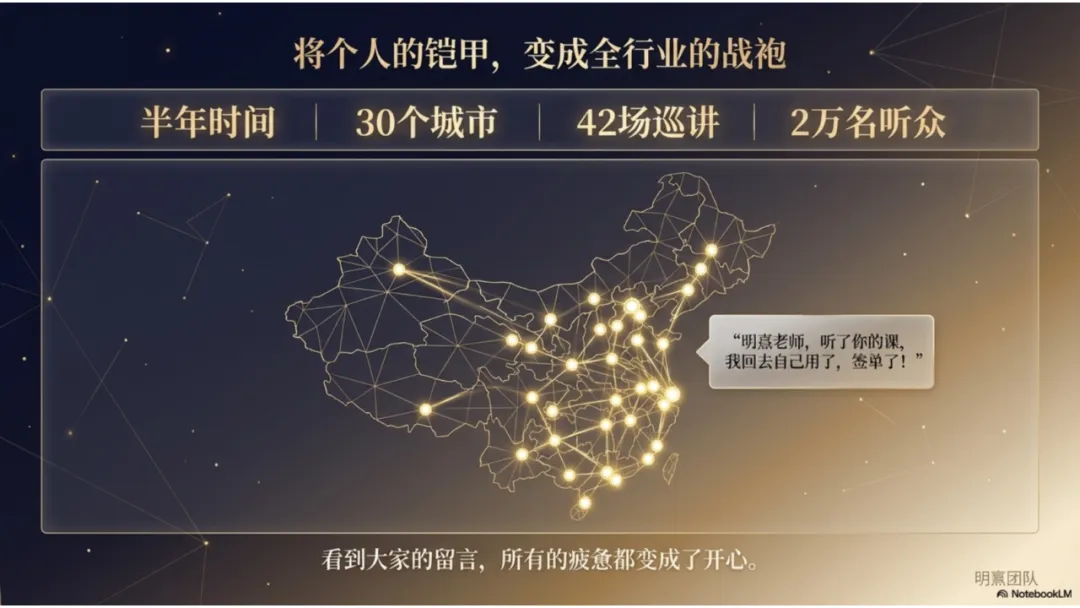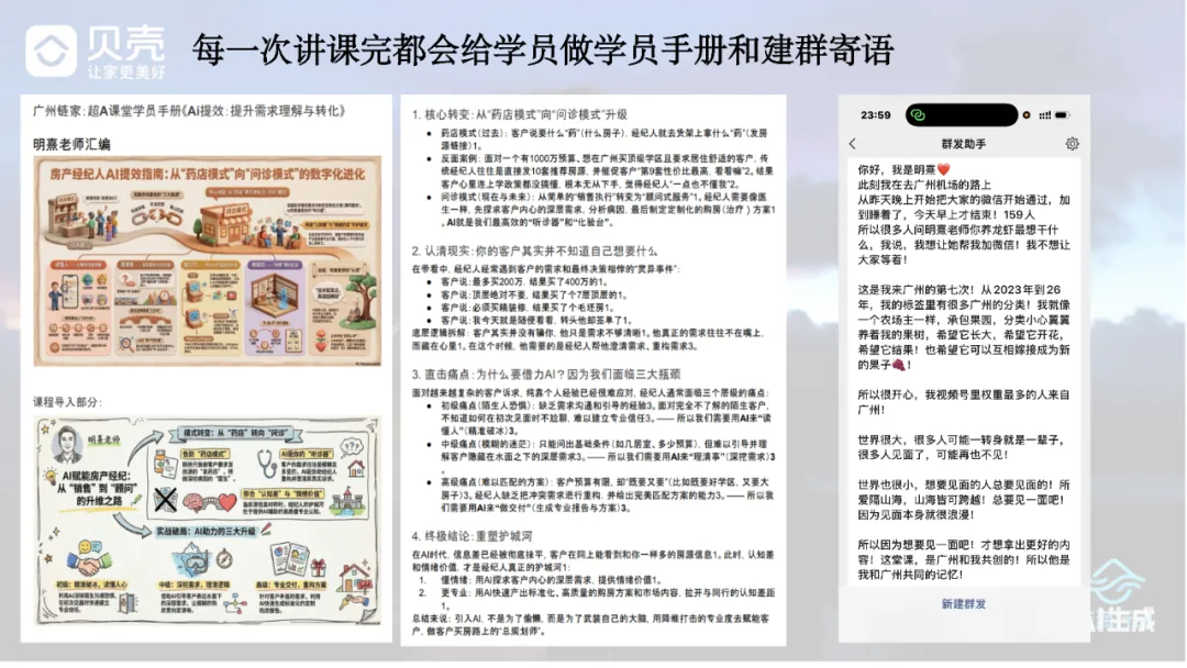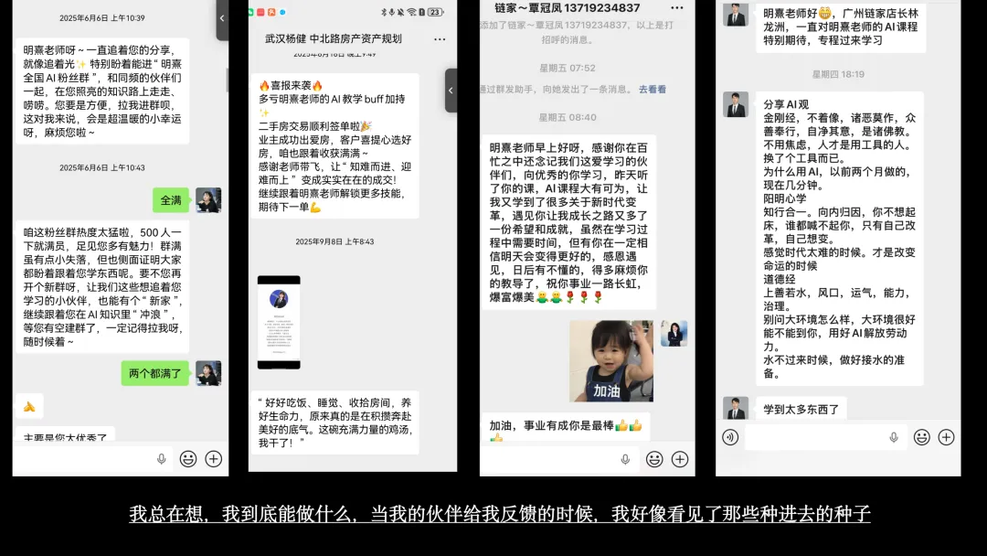 2024年5月,我做出了一个艰难的决定——我要走出去,把AI的方法论讲给我的同事们听。因为我知道未来的房地产经纪人缺什么,我希望哪怕能因为我而改变一点点行业现状也好。在半年的时间里,我飞了30个城市,讲了42场课,给23000多名学员送去了AI的武器。我把自己的实战经验、课件、知识库毫无保留地拆解出来,甚至推动城市公司举办AI大赛。为了影响更多人,11月份我做了视频号。尽管有人质疑我“是不是想割韭菜卖课”、“心术不正”,在无数个深夜里我也曾自我怀疑,但徐东华老师的一句话点醒了我:“你要提高的是行业的影响力。”