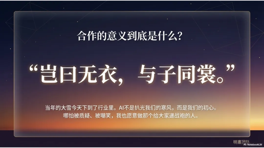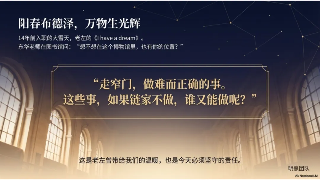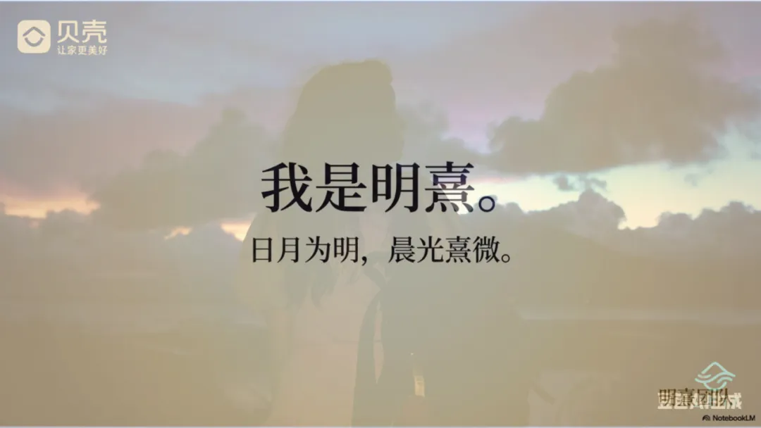 回到最初的那个名字,“岂曰无衣,与子同裳”。AI究竟是什么?在行业最艰难的时刻,AI绝不仅仅是一个工具,它是我们所有人抱团取暖的篝火。我希望通过AI,提升全行业的综合素质,让每一位在一线奋斗的从业者,都能成为“有尊严的服务者”。我骄傲,我是北京链家的房地产经纪人,我曾经在老左的教导下,我曾经在太多的优秀的老师的教导下,茁壮成长,如今,我终于可以发芽了,可以也为我的公司,甚至我的热爱的行业,做一点事情。那是我的公司,一直以来,给我的价值观与底气。是我我未来,面对风雨的脊梁。再介绍一下我自己。我叫明熹,“日月为明,晨光熹微”。在这个漫长的行业凛冬中,启明星升起的时候,天可能还是黑的;但只要星光在闪烁,前行的人就会知道方向。