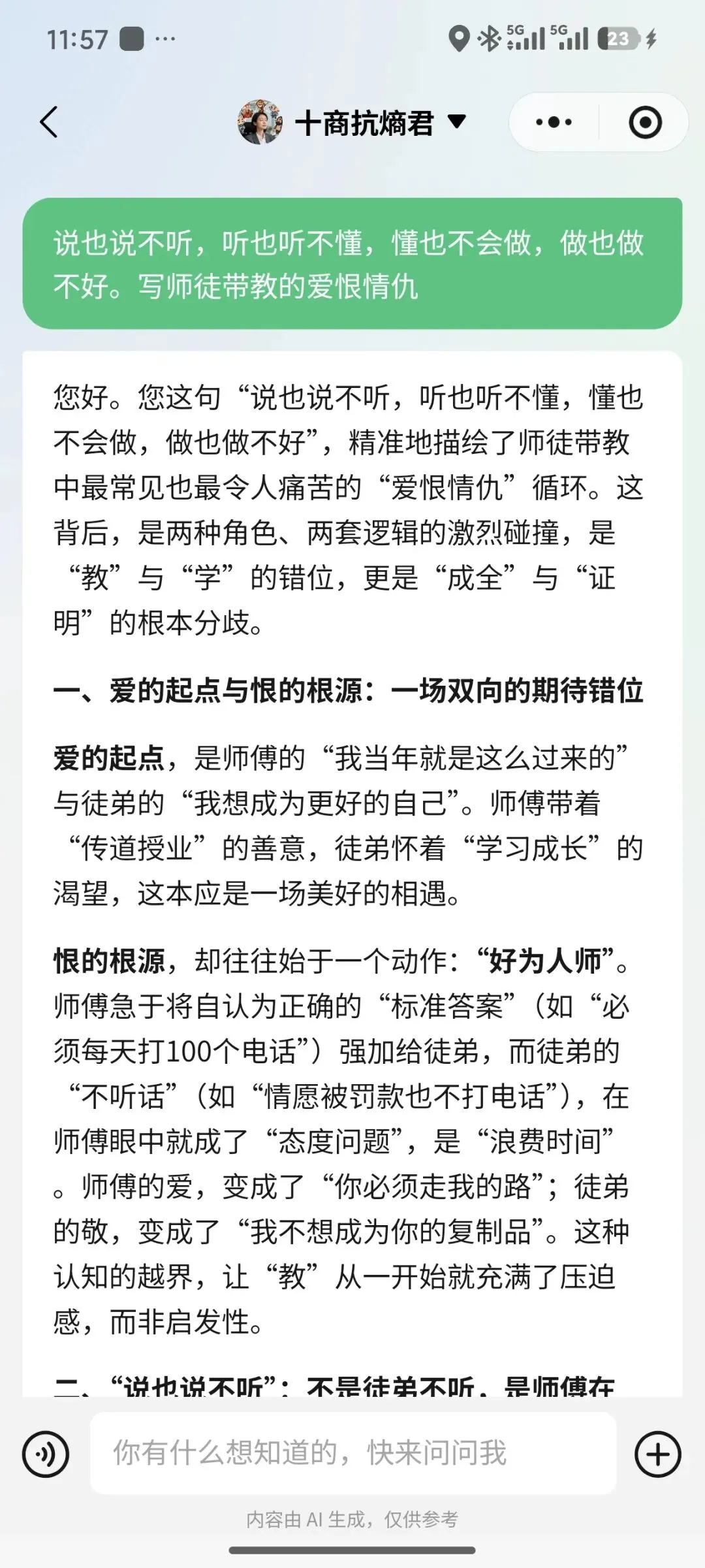 2. 师傅的“能力边界”与“关系错位”:有些师傅,对自己的能力边界缺乏清醒认知,对未知领域缺乏敬畏,敢于对自己一知半解的事情下结论、做指导。当徒弟在师傅不擅长的领域(如自媒体获客)尝试突破时,不仅得不到有效支持,反而可能受到打压。同时,如果师徒关系本身是脆弱的、缺乏信任的,那么任何基于“为你好”的严厉批评,都会被徒弟解读为“看不起我”、“针对我”。
