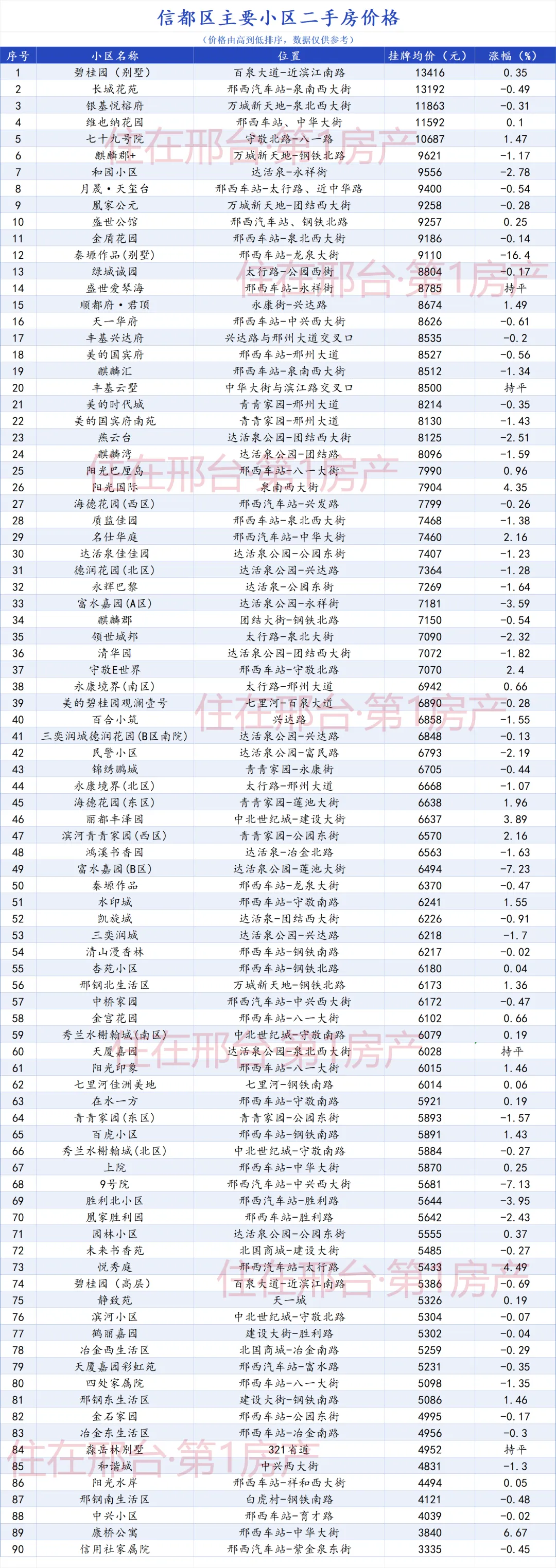 信都区统计小区共90个,降价69个小区,涨价18个小区,持平3个小区。