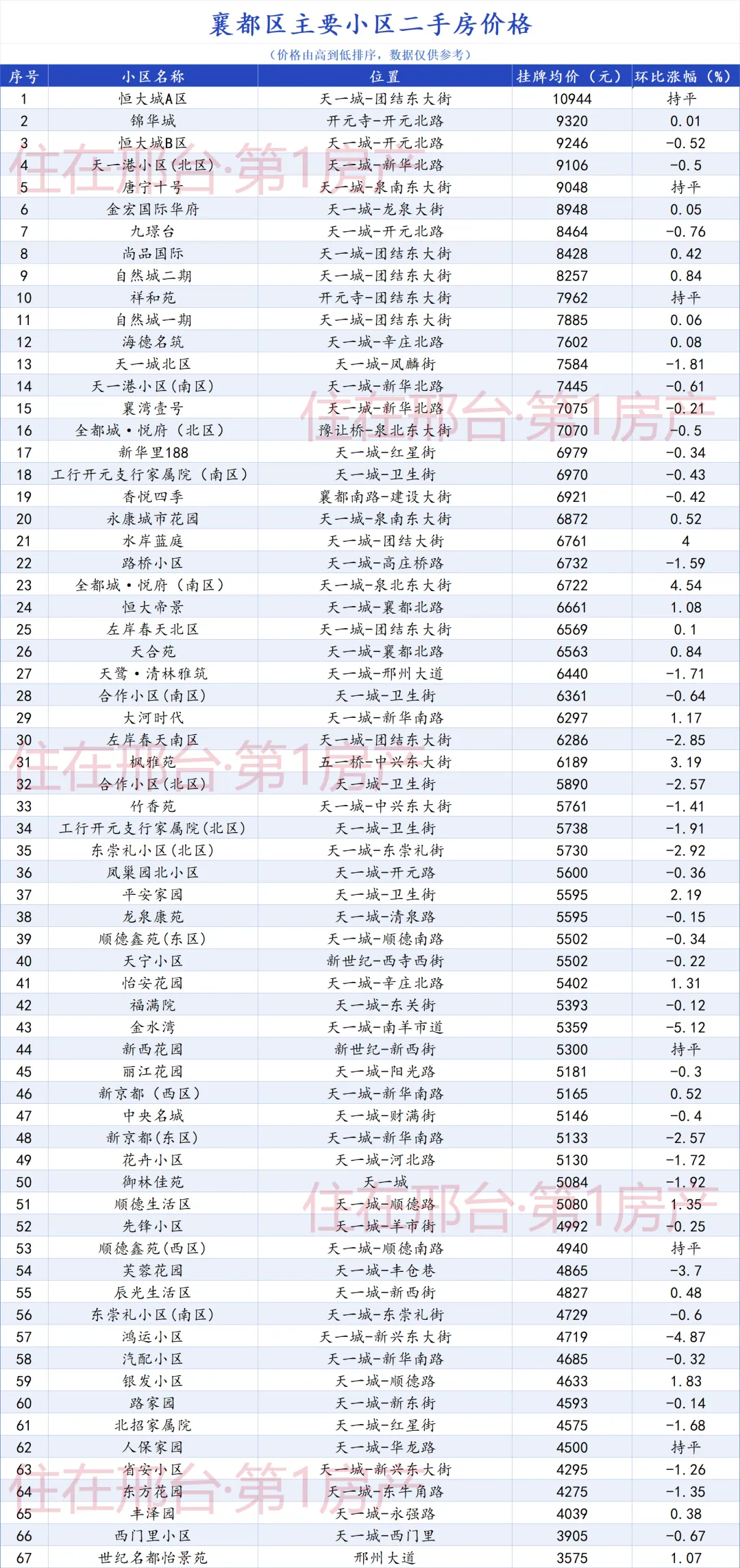 与信都区类似,襄都区也呈现明显的降价主导格局(降价占比71.6%)。价格前三的小区均位于“天一城”核心板块,显示出地段的价值。