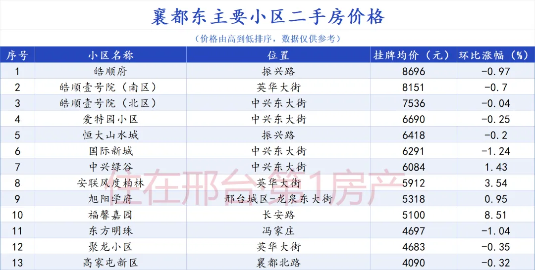 襄都东区统计小区共13个,降价8个小区,涨价5个小区,持平0个。