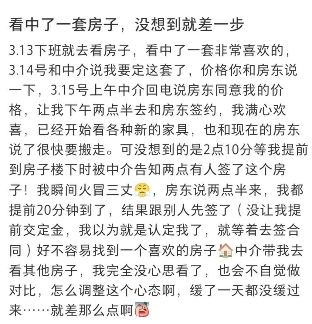 一名网友分享了自己的亲身经历:下班去看中一套房子,中介沟通好价格,约好周五下午两点半去签约。结果提前20分钟到楼下,却被中介告知——两点已经有人签了。给正在租房的朋友提个醒:看中了就尽快落定,口头确认在市场热的时候保障力很有限。