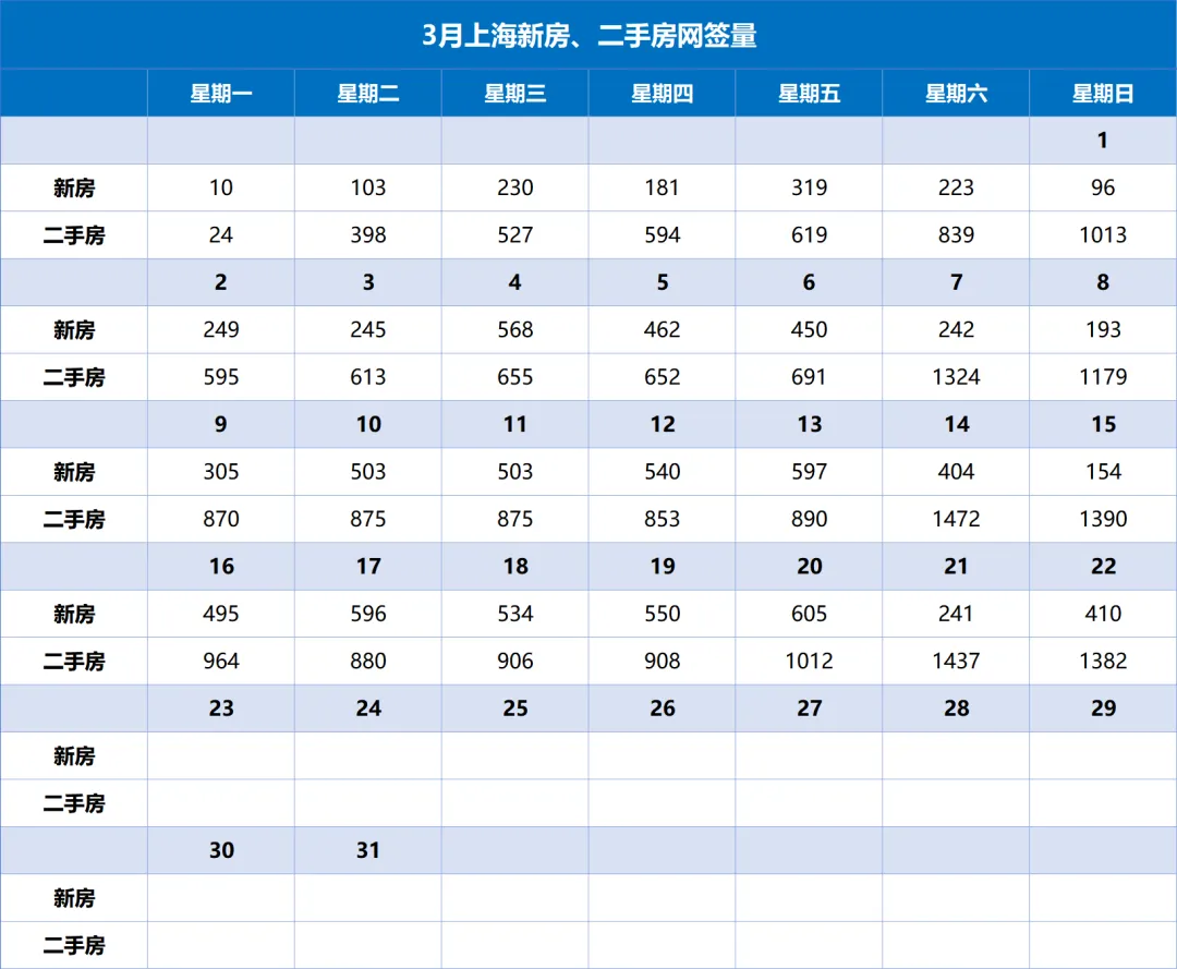 根据网上房地产数据显示,上周(3月16日至3月22日),上海新房共计网签3431套,日均成交量约490套,增长14%。