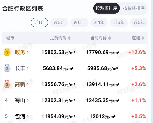 分别是政务、长丰、高新、蜀山、包河,其中涨幅最大的为政务区,涨幅达到了12.6%。