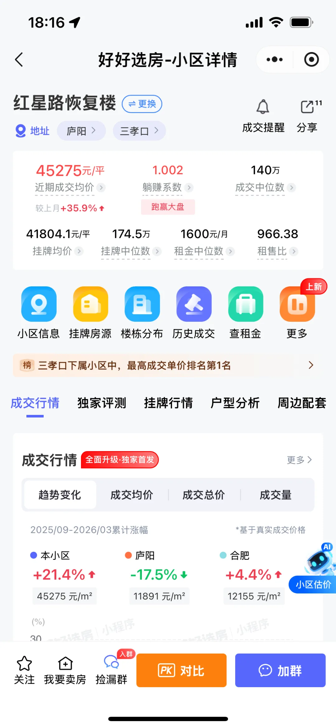 南门小学 + 合肥市第四十五中学的学区房红星路恢复楼,成交单价高达45275元/㎡。