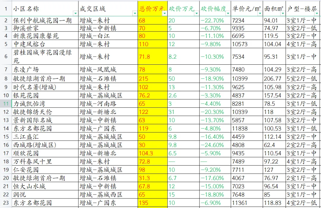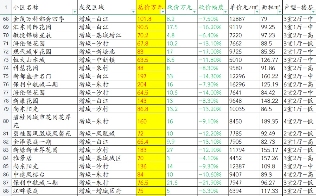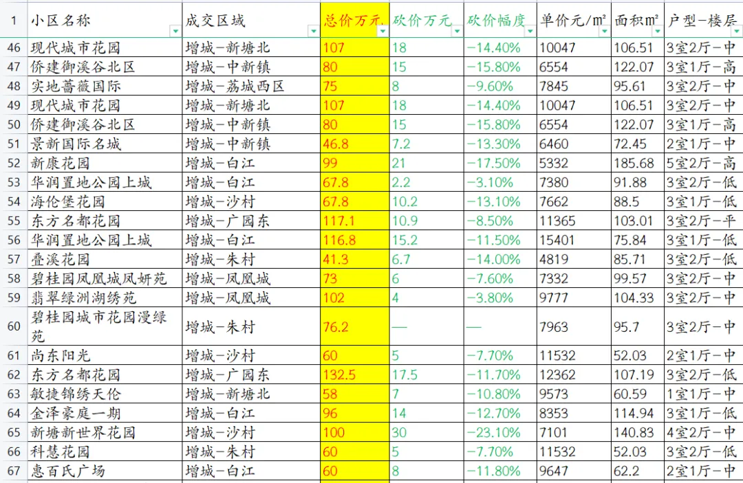 数据详情请查看图片,其中总价代表真实成交价,砍价万元+总价万元=挂牌价。