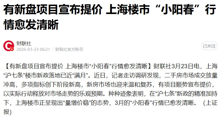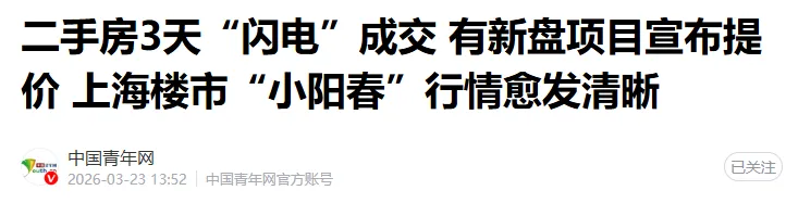 吃饭时刷到一则权威媒体的楼市报道,标题很直白:《二手房3天“闪电”成交 有新盘项目宣布提价 上海楼市“小阳春”行情愈发清晰》。读完很有感触,今年楼市的热度,确实和往年不太一样,不再是短暂的季节性回暖,而是带着明显趋势性的变化。