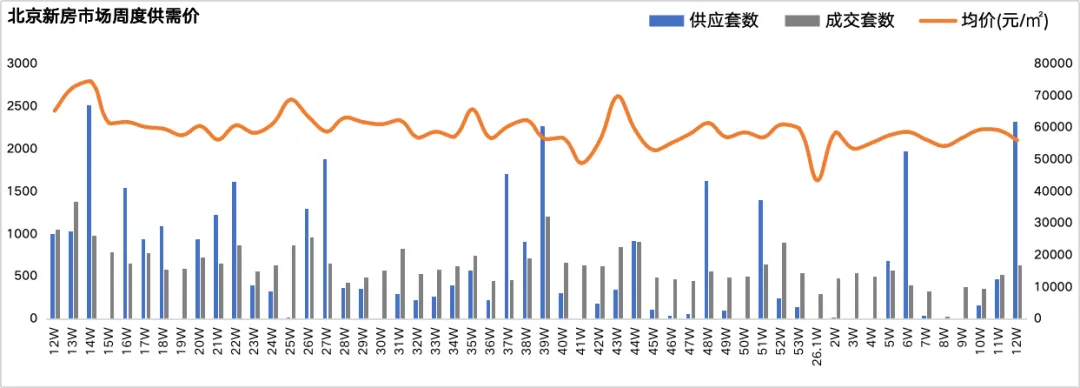 先看整体数据:上周新房新增供应2321套/27.51万㎡,而成交仅631套/7.8万㎡,供需差距显著;成交均价56605元/㎡,成交金额44.17亿,在供应放量的背景下,成交端显得相对温和。