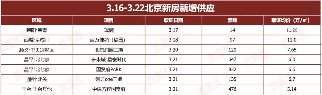 供应端方面,上周共计7个项目取证,供应大头来自昌平,两个项目共计1479套房源,占周度供应量的64%。