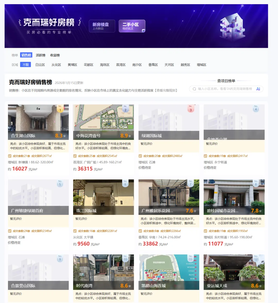 大家可登录克而瑞·好房点评网二手小区销售榜,看看现在广州成交最活跃的二手小区都在哪里。