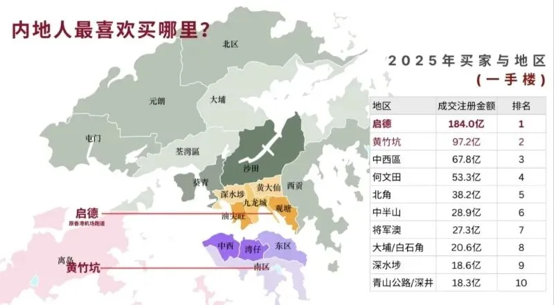 我们先看数据,2025年内地人买香港一手楼,启德直接干到184亿,差不多是第二名黄竹坑的两倍,这不是跟风,是真的需求摆那了,而背后的房价梯度,也刚好对应了不同人群的选择。