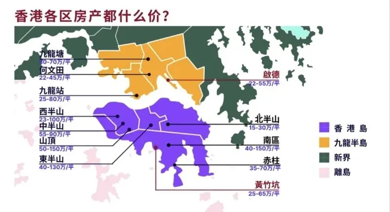 九龙半岛的其他区域也各有定位:九龙塘单价30-70万/平,是传统的名校豪宅区,适合重视教育的家庭;九龙站单价25-80万/平,依托ICC和西九龙高铁站,是跨境商务人士的首选,交通便利、商业配套顶级,房价也跟着地段水涨船高。